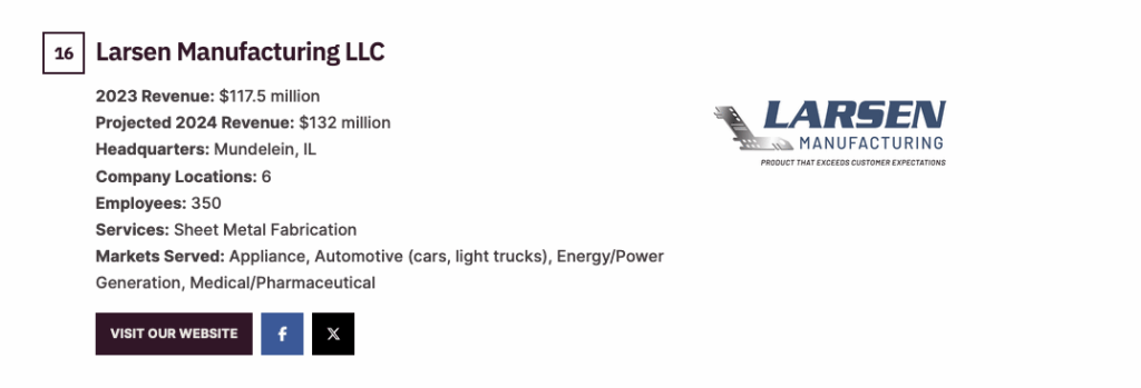 This year, Larsen Manufacturing has jumped to the #16 position, up from the #17 spot last year.